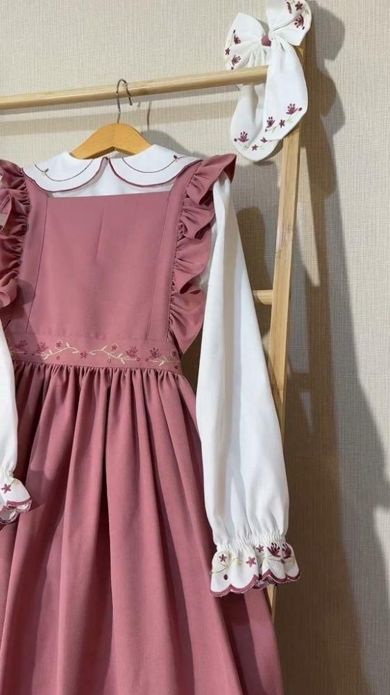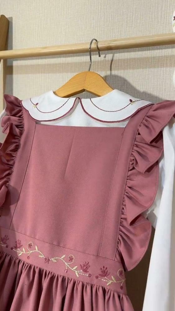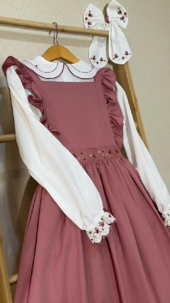 التصميم : يحتوي على قطعتين منفصلتين، الأولى قميص باللون الأبيض ، والثانية المريول المتميز باللون الوردي بطول كامل يصل إلى القدمين ، مع أكمام قصيرة و2 جيب من الأمام
